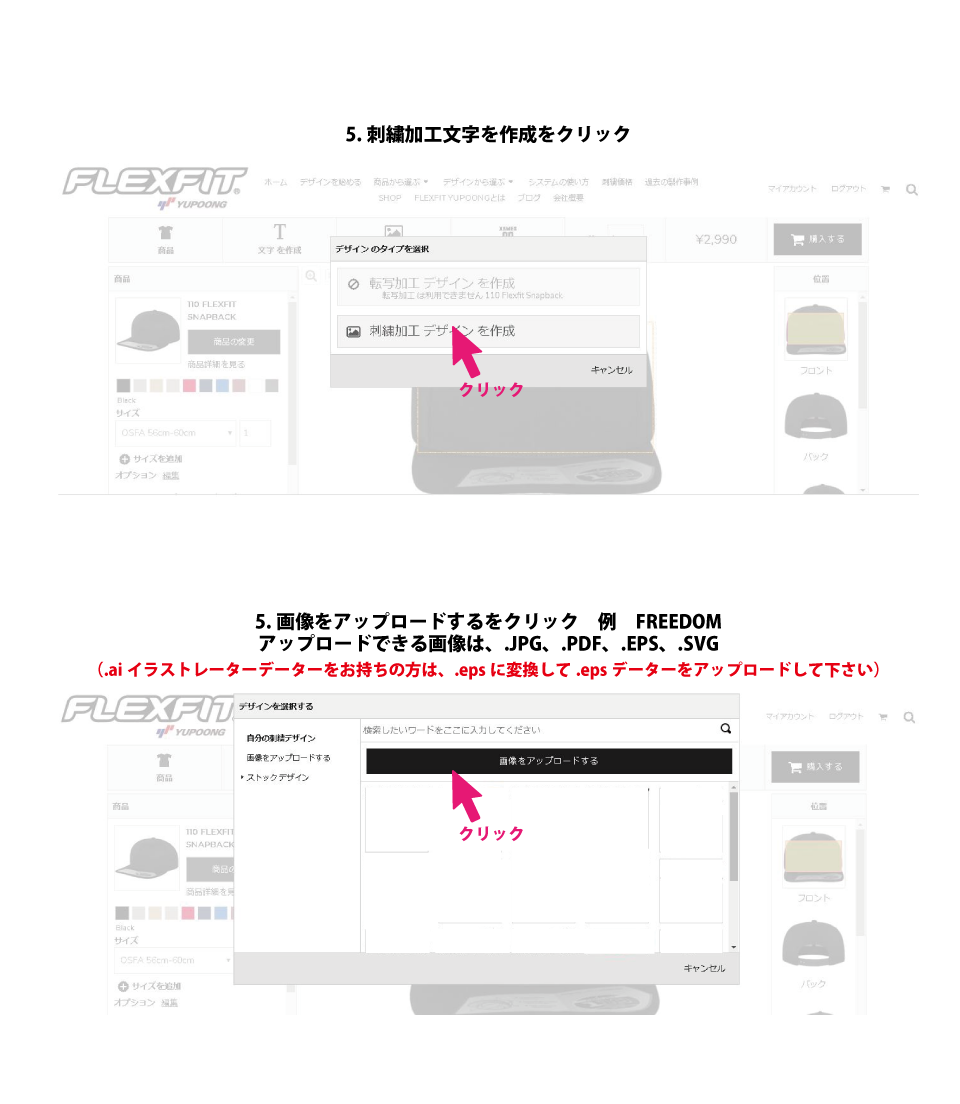 アップロードできる画像はjpg、gif、png、eps、cdr、刺繍用データファイル.emb