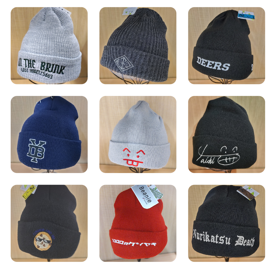 キャップ・ニット・パーカーに自由にカスタム刺繍可能。