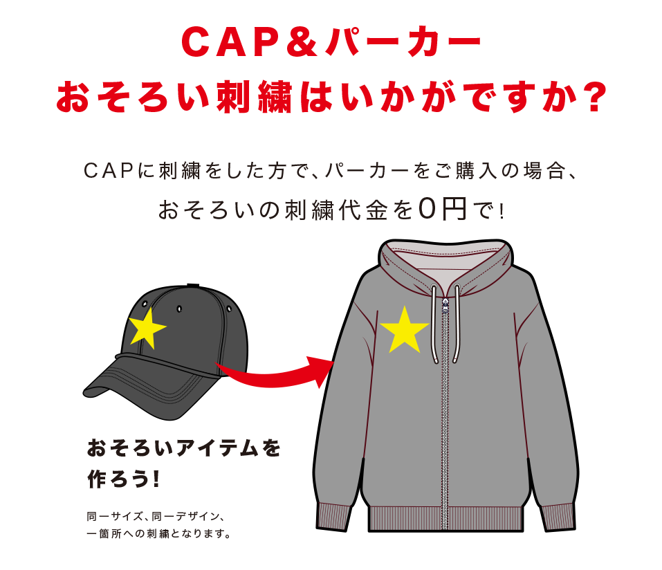 キャップ&パーカーセット販売|パーカーの刺繍料金が無料!